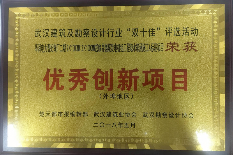 7月29日,2018年武汉建筑及勘察设计行业“双十佳”评选活动颁奖典礼在武汉市楚天传媒大厦隆重举行,由中冶武勘承建的“华润电力曹妃甸电厂二期2×1000MW超超临界燃煤发电机组工程取水箱涵施工A标段项目”以第一名的成绩荣获“优秀创新项目(外埠地区)”奖。